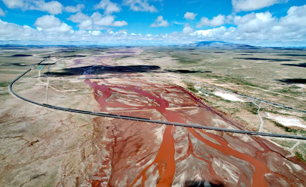 青藏鐵路通過(guò)辮狀河道的沱沱河(7月26日攝,無(wú)人機(jī)照片)。新華社記者 劉詩(shī)平 攝