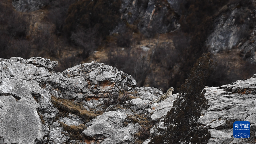 一只雪豹在位于三江源國家公園瀾滄江源園區(qū)內(nèi)的青海省玉樹藏族自治州雜多縣昂賽大峽谷內(nèi)休息(2023年2月21日攝)。新華社記者 張宏祥 攝