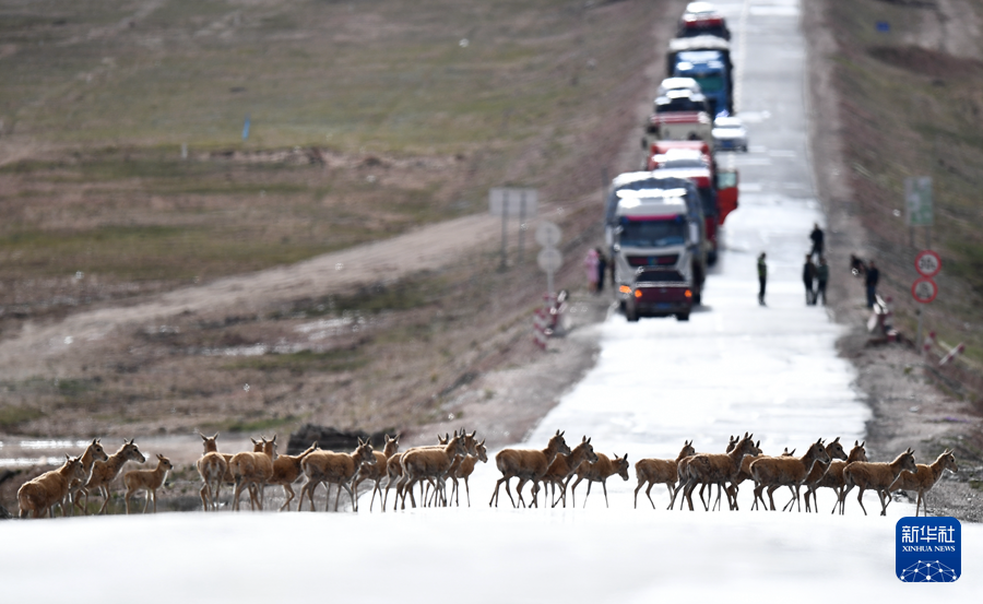 一群藏羚羊通過青藏公路前往青海三江源地區(qū)(2023年7月28日攝)。新華社記者 張宏祥 攝