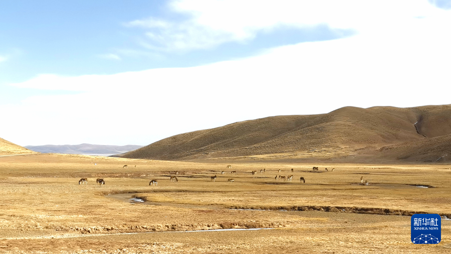 2022年3月12日,在三江源國家公園黃河源園區(qū)內(nèi),一群藏野驢在草灘上吃草。新華社記者 呂雪莉 攝