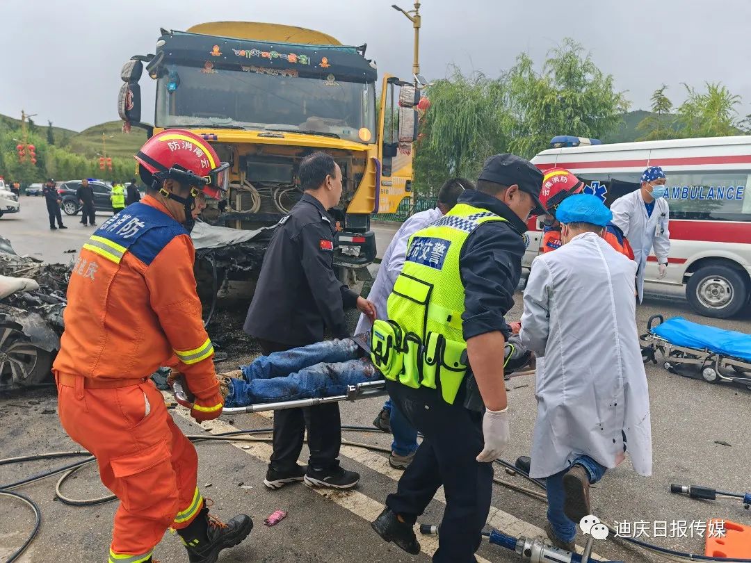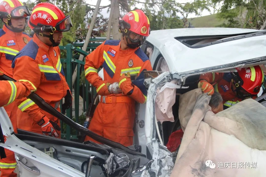 接到調令后,香格里拉消防救援站立即出動2車13人前往處置,到達現(xiàn)場后,發(fā)現(xiàn)一輛小轎車與一輛貨車相撞,轎車嚴重受損變形,車內安全氣囊已彈出,副駕駛位被困人員頭部、腿部多處受傷無法動彈,意識模糊,有嚴重生命危險。