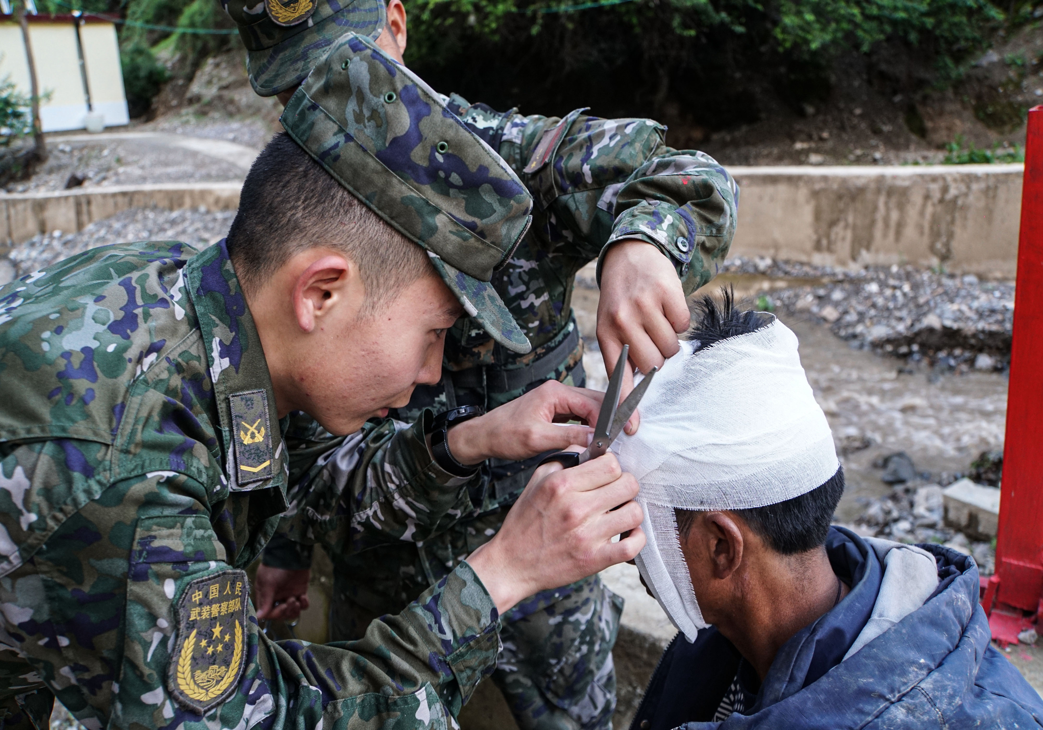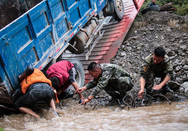 “同志,不要怕,我們是武警官兵,我們先給你處理傷口?!?甕云飛一邊安撫受傷群眾的情緒,一邊為他消毒止血、包扎傷口。后經(jīng)檢查,該群眾除了頭部有輕微皮外傷外,全身并無大礙。之后,中隊官兵又和當?shù)厝罕娨黄鹜度胲囕v緊急救援,經(jīng)過幾個小時的努力,大家齊心協(xié)力將貨車拖至安全地帶。