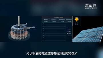 光伏板發(fā)的電通過變電站升壓到330KV,經(jīng)過50多公里長的高壓輸電線路輸送到龍羊峽水電站,水電站再根據(jù)總的發(fā)電任務(wù)和光伏實時發(fā)電量調(diào)節(jié)水電,實現(xiàn)“削峰填谷”,最終并網(wǎng)向外輸送。
