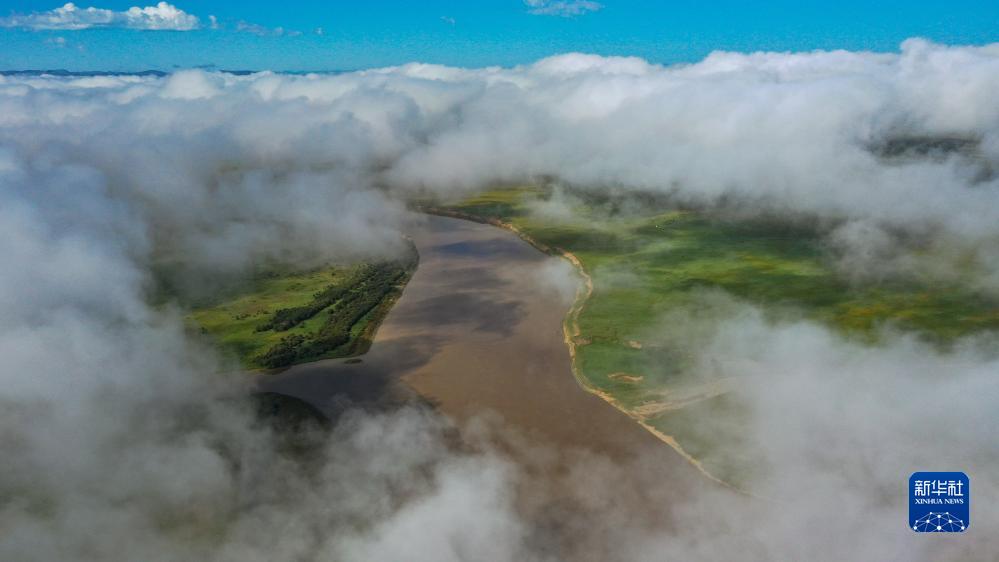 這是8月22日清晨在四川省阿壩藏族羌族自治州若爾蓋縣唐克鎮(zhèn)拍攝的黃河九曲第一灣景色(無人機照片)。新華社記者 王曦 攝