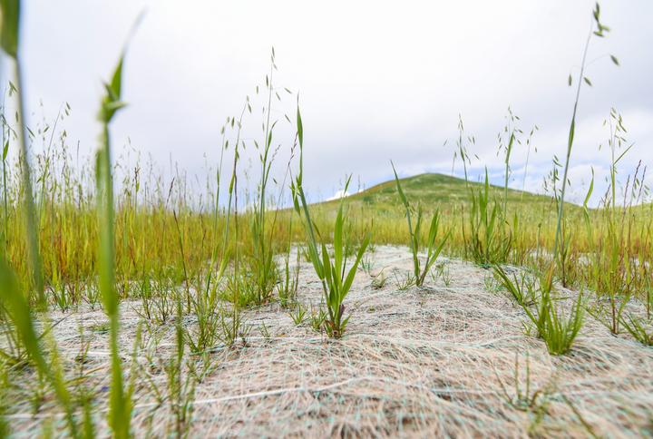 在若爾蓋縣唐克鎮(zhèn)嘎?tīng)柆敶?,這里的草原生態(tài)修復(fù)項(xiàng)目已完成近三個(gè)月。目之所及,蓋上“椰絲毯”的坡面,與遼闊的若爾蓋大草原融為一體。披堿草、老芒麥、高冰草和黑麥草從“椰絲毯”織成的小方格中破土而出,最高已近半米。
