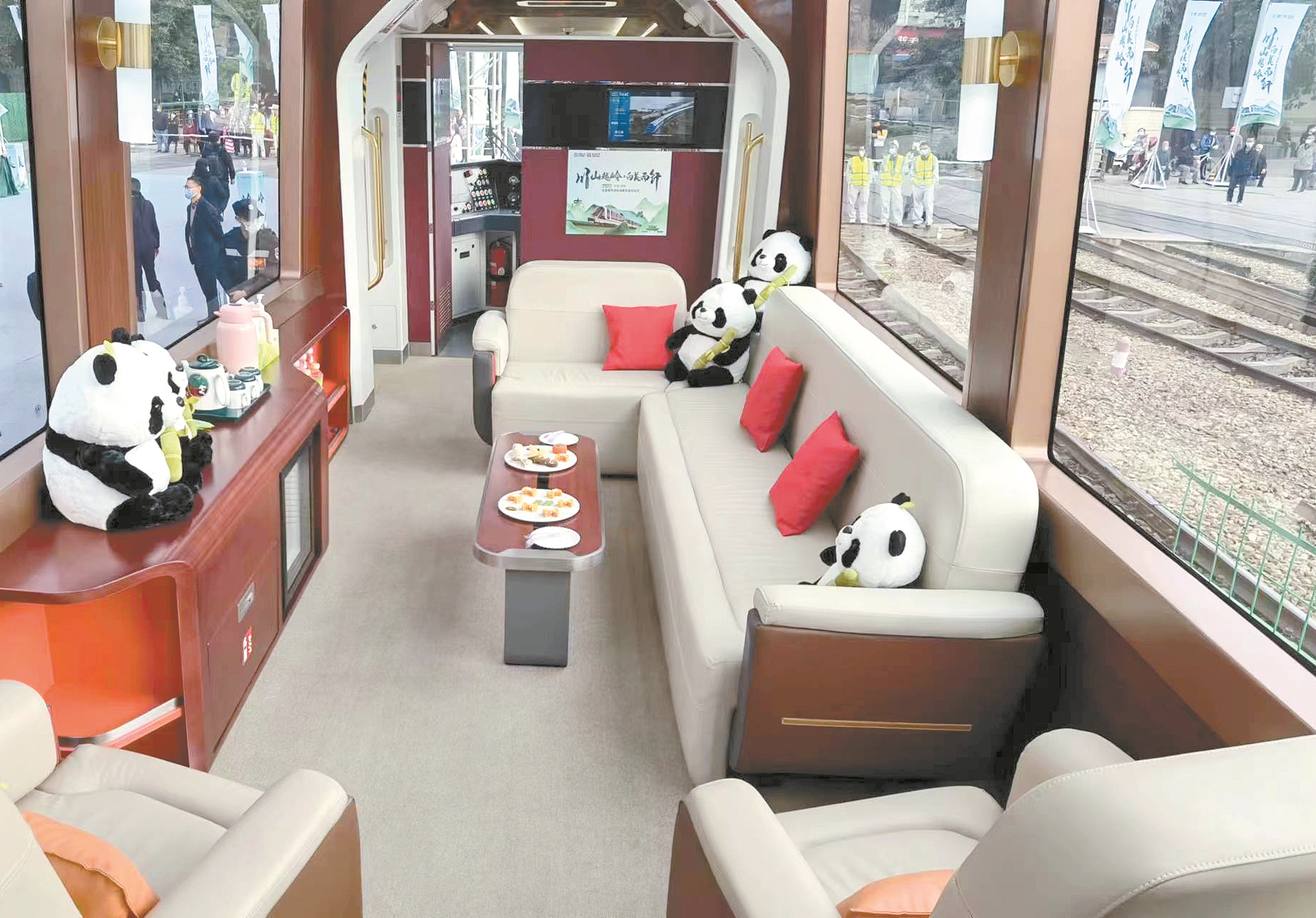 “列車采用4節(jié)編組,額定載客數(shù)145人,內(nèi)飾分為豪華VIP家庭式包廂、豪華觀光卡座區(qū)、普通座區(qū)三種座位區(qū),滿足乘客多種乘車需求。它還具有國(guó)內(nèi)最大面積曲面觀光玻璃窗,可實(shí)現(xiàn)車內(nèi)游客與自然景觀的深度交流?!毕嚓P(guān)負(fù)責(zé)人向記者介紹道。