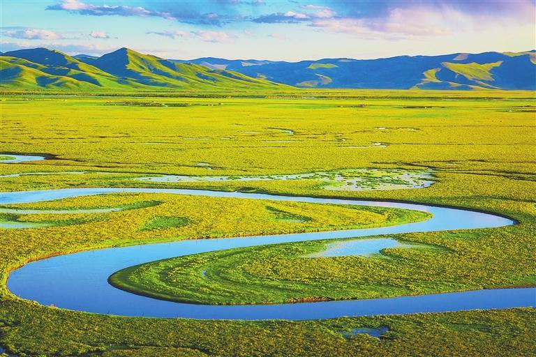 黃河首曲,阿萬倉濕地,綠毯似的草地一望無際,支流如飄帶般蜿蜒其間。