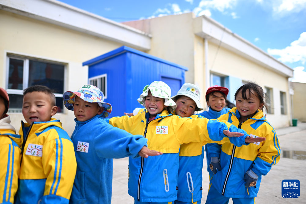 在曲麻萊縣秋智鄉(xiāng)幼兒園,小朋友們排隊玩游戲(9月13日攝)。新華社 韓方方 攝