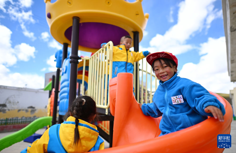 在曲麻萊縣秋智鄉(xiāng)幼兒園,仁青卓瑪(右)和伙伴們在校園內(nèi)玩耍(9月13日攝)。新華社 韓方方 攝
