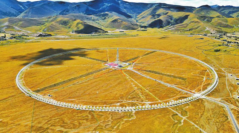 飛機(jī)從稻城亞丁機(jī)場起飛,右側(cè)舷窗外的地面隱現(xiàn)一個(gè)小圓點(diǎn),因?yàn)樵煨吞厥?,?dāng)?shù)厝朔Q“千眼天珠”。小圓點(diǎn)其實(shí)一點(diǎn)也不“小”——在海拔3820米的四川省甘孜州稻城縣噶通鎮(zhèn),313部直徑6米的天線,均勻地分布在直徑1公里的圓環(huán)上。它的正式名字叫圓環(huán)陣太陽射電成像望遠(yuǎn)鏡(下稱“圓環(huán)陣”),是國家重大科技基礎(chǔ)設(shè)施空間環(huán)境地基綜合監(jiān)測網(wǎng)(子午工程二期)的標(biāo)志性設(shè)備之一,也是目前已建成的全球規(guī)模最大的綜合孔徑射電望遠(yuǎn)鏡。其任務(wù)主要是對太陽和日地空間傳播鏈條進(jìn)行高質(zhì)量監(jiān)測,監(jiān)測太陽“打噴嚏”。