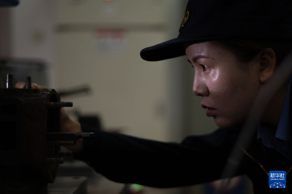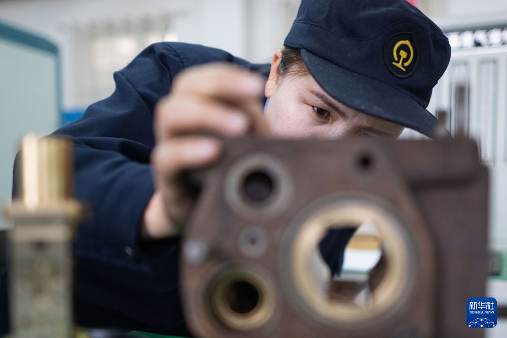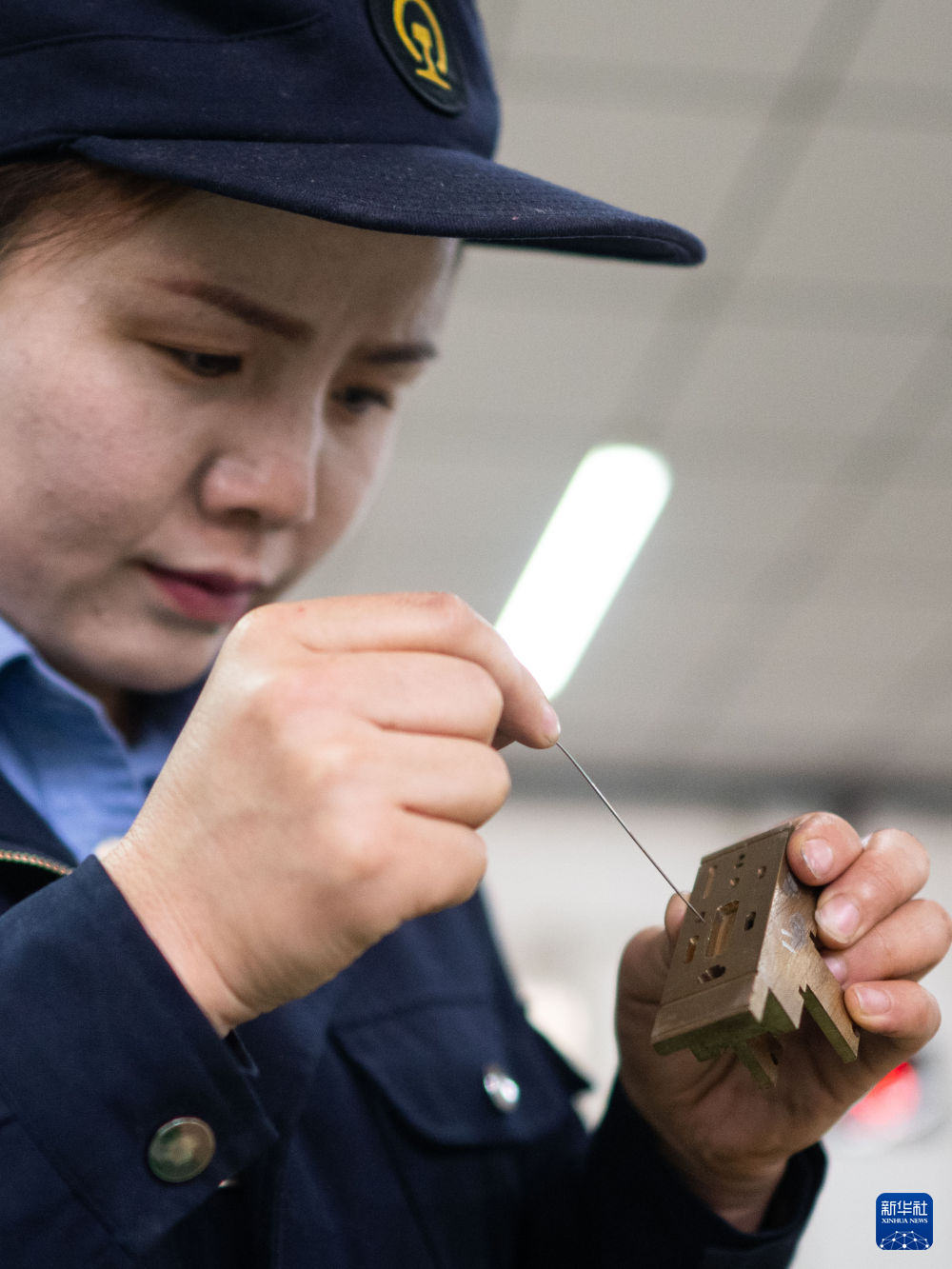 10月12日,在中國(guó)鐵路青藏集團(tuán)有限公司西寧東車輛段制動(dòng)班組,馬婷對(duì)120閥滑閥內(nèi)部通路進(jìn)行疏通。新華社記者 張龍 攝