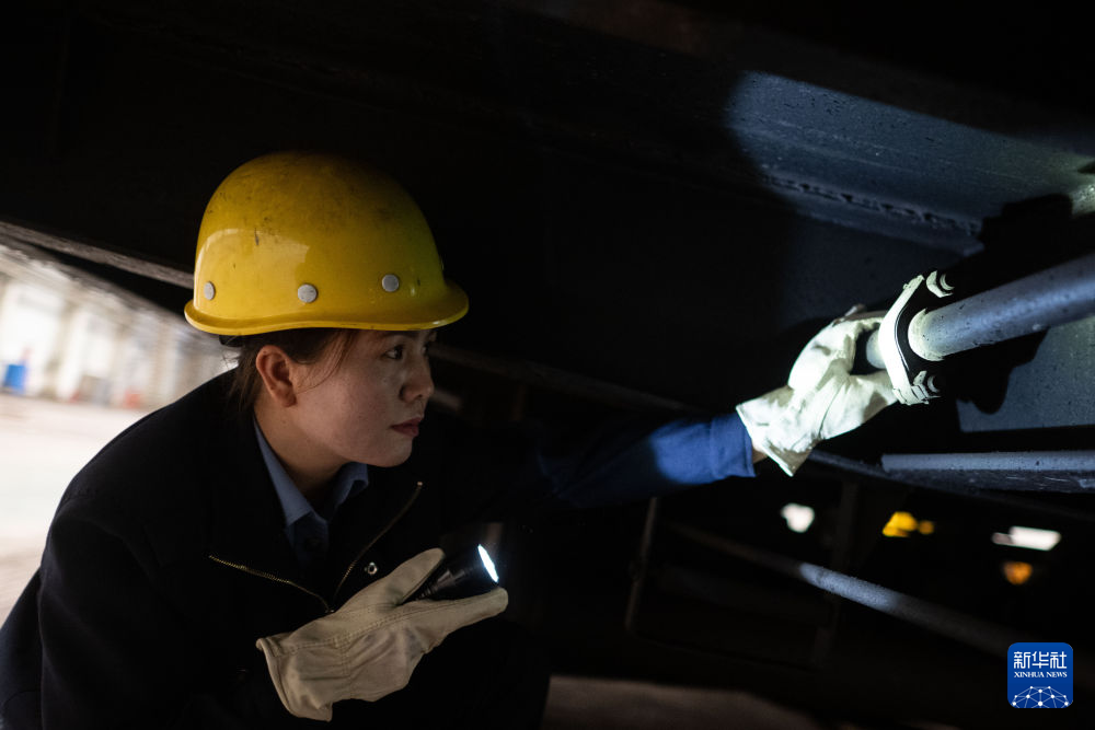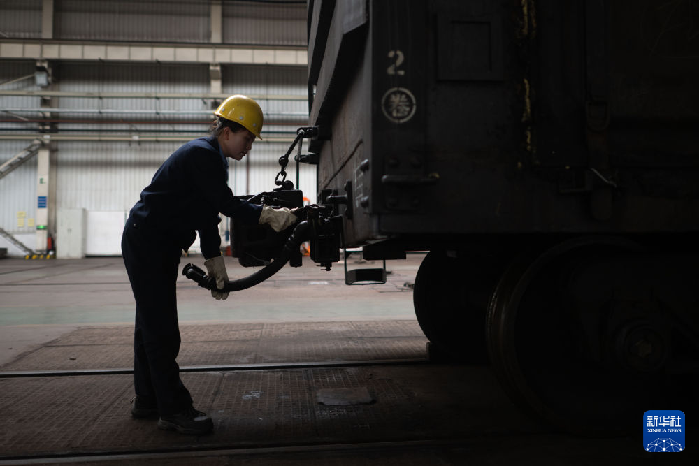 10月12日,在中國(guó)鐵路青藏集團(tuán)有限公司西寧東車輛段制動(dòng)班組,馬婷在檢查貨車車輛制動(dòng)軟管。新華社記者 張龍 攝