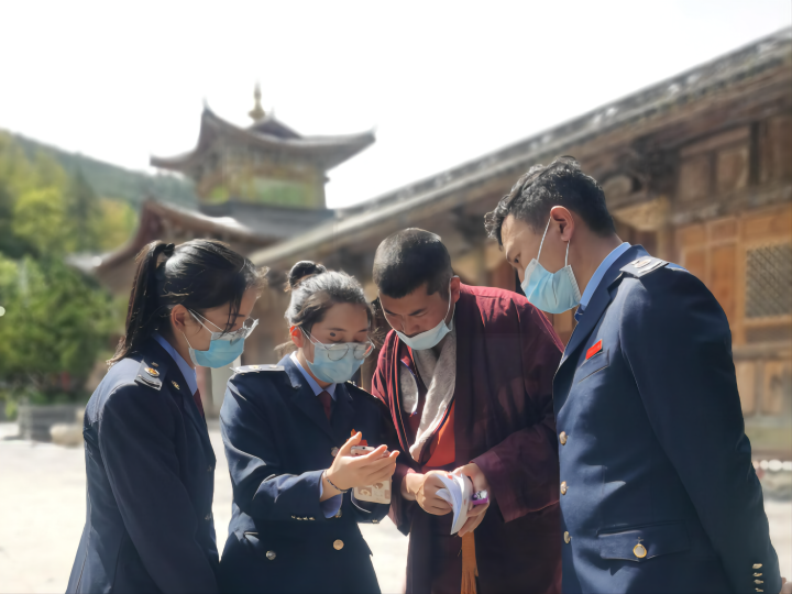 圖為縣稅務(wù)局“傈鄉(xiāng)稅宣小分隊”上門為壽國寺的藏傳佛教僧眾開展城鄉(xiāng)“兩險”手機繳納流程輔導(dǎo)和民族團結(jié)進步相關(guān)知識宣傳。