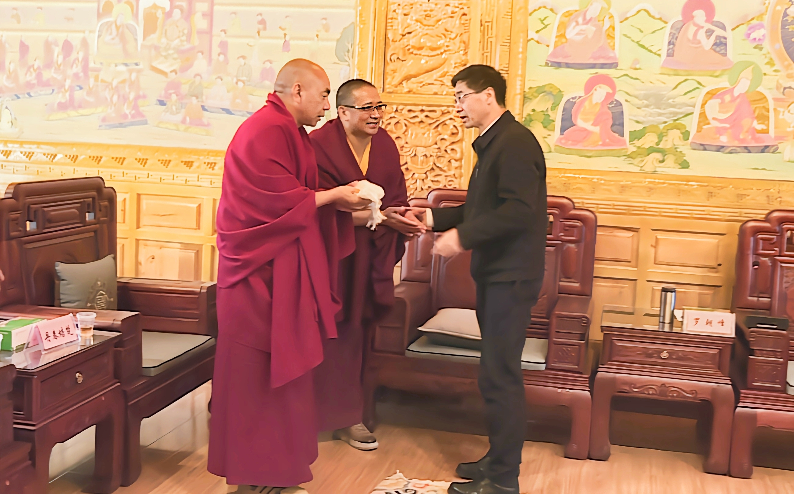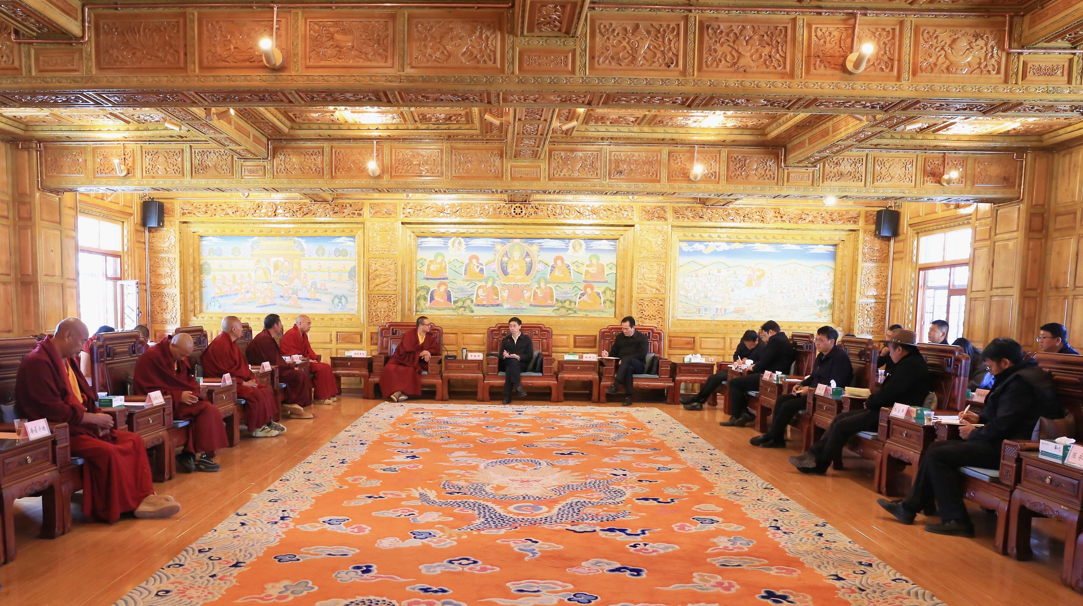 在松贊林寺,羅朝峰與宗教界代表人士深入交流座談,詳細了解僧人學(xué)修、生活等情況,面對面傾聽他們的心聲、訴求,引導(dǎo)僧人們從多年來國家面貌、人民生活發(fā)生的變化,松贊林寺基礎(chǔ)設(shè)施、僧人修行條件的變化中憶苦思甜,感念黨恩。希望他們珍惜和諧穩(wěn)定的大好局面和良好的修行生活條件,深入踐行習(xí)近平總書記提出的“政治上靠得住、宗教上有造詣、品德上能服眾、關(guān)鍵時起作用”政治要求,繼承和發(fā)揚愛國愛教的優(yōu)良傳統(tǒng),進一步鑄牢中華民族共同體意識。