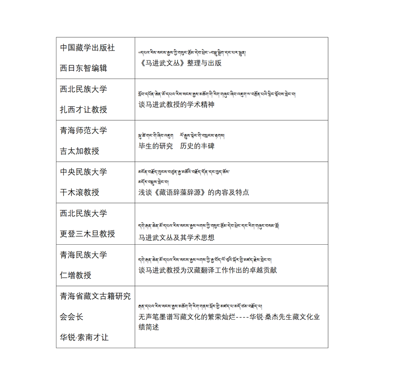中國藏學(xué)研究中心原副總干事洛桑靈智多杰,青海省省志辦原總編、藏文古籍研究會名譽(yù)會長謝佐,西北民族大學(xué)科研處副處長英加布,甘肅省藏學(xué)研究學(xué)會副會長傅千吉,宗拉昌瓦公司總經(jīng)理扎西加等專家學(xué)者對《馬進(jìn)武文叢》的學(xué)術(shù)水平和現(xiàn)實意義給予了高度評價,認(rèn)為該系列叢書不僅體現(xiàn)并傳承了馬進(jìn)武先生的學(xué)術(shù)思想,而且在推動新時代藏語文研究和藏漢翻譯事業(yè)發(fā)展、促進(jìn)學(xué)術(shù)合作,推動民族語言學(xué)學(xué)科繁榮和進(jìn)步等方面,具有高度的學(xué)術(shù)性和現(xiàn)實意義。西藏自治區(qū)藏醫(yī)院副院長銀巴研究員、四川民族出版社社長澤仁扎西、青海師范大學(xué)原副校長扎布教授、夏壩·嘉央克珠、甘肅華銳剛乃旦才讓、青海民族大學(xué)旦正教授、青海民族出版社副社長阿寧·扎西東主等對《馬進(jìn)武文叢》的出版發(fā)行表示祝賀。