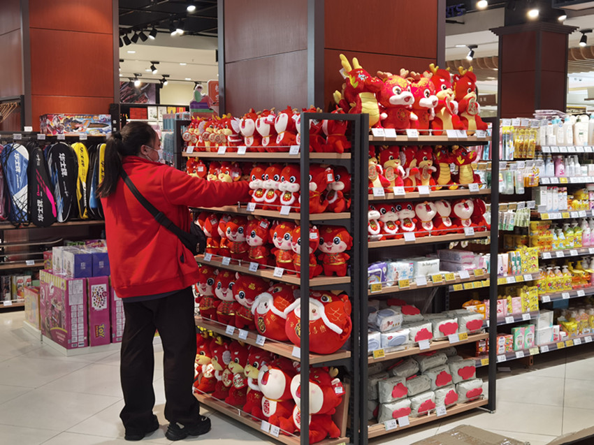 農(nóng)貿(mào)市場一片火熱景象,而在各大超市里,各種龍年喜慶元素的年貨擺在貨架最顯眼的位置,增添了不少節(jié)日氛圍。顧客以年輕人居多,購物車?yán)锇b精美的各類產(chǎn)品琳瑯滿目。