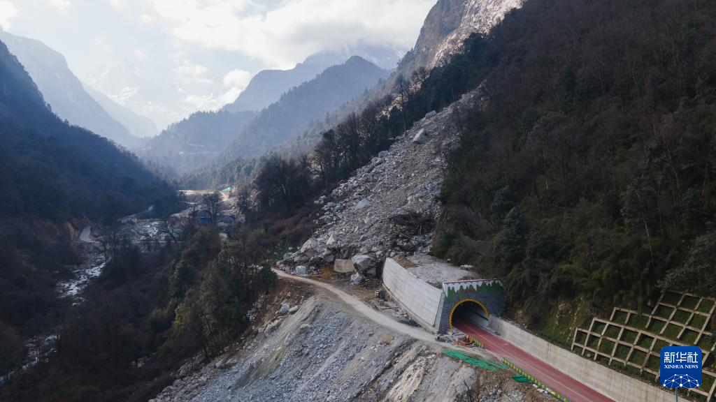 這是1月10日拍攝的海螺溝景區(qū)公路上一處新建的隧道(無人機照片)。景區(qū)重建時,避開地質(zhì)災(zāi)害點新建了4個隧道,抗災(zāi)能力得到提升且縮短了通往景區(qū)的時間。新華社記者 胥冰潔 攝