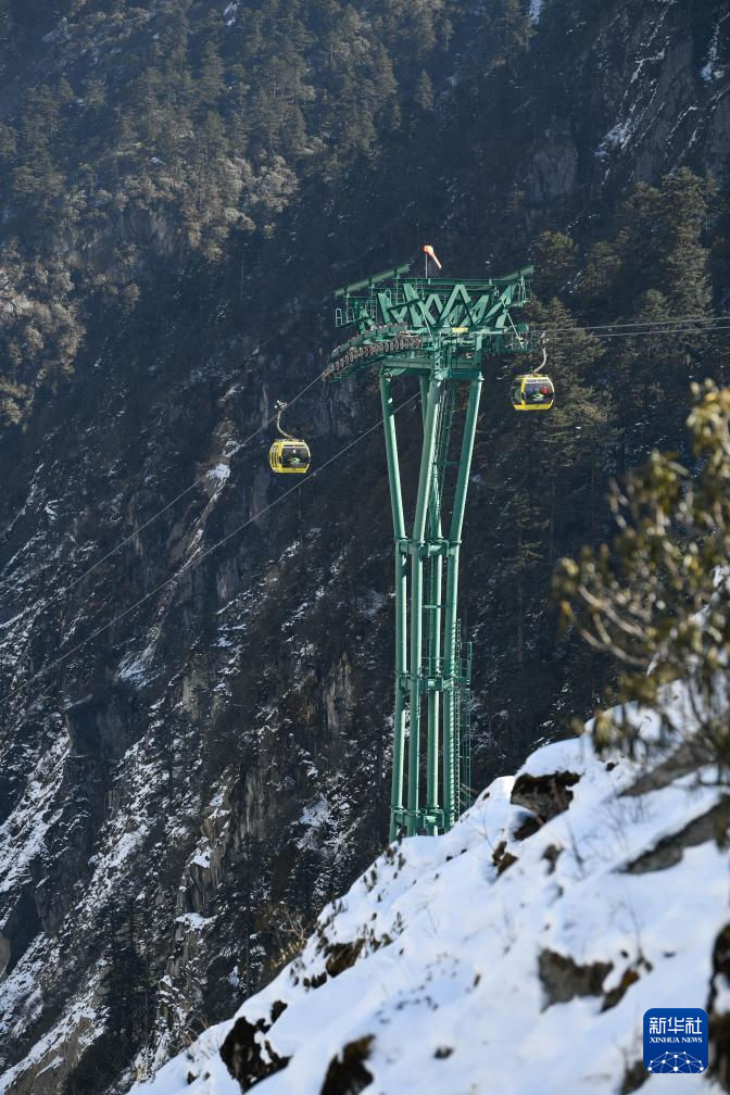 這是1月10日拍攝的海螺溝景區(qū)內(nèi)運行的觀光纜車。新華社記者 胥冰潔 攝
