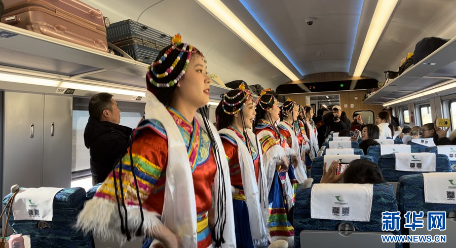 “提前祝各位旅客新春快樂,吉祥如意,扎西德勒!”藏族舞蹈《吉祥歡歌》把車廂內(nèi)的氛圍推入高潮,鐵路職工身著藏族服飾,歡快的音樂和動人的舞姿令人陶醉,乘客們的情緒也被帶動起來,隨著表演者們一起拍手歌唱。