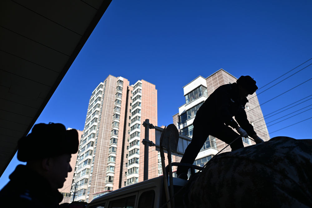 在青海省海西蒙古族藏族自治州格爾木市,可可西里森林公安局兩名巡山隊(duì)員正在裝車(1月18日攝)。新華社記者 張宏祥 攝