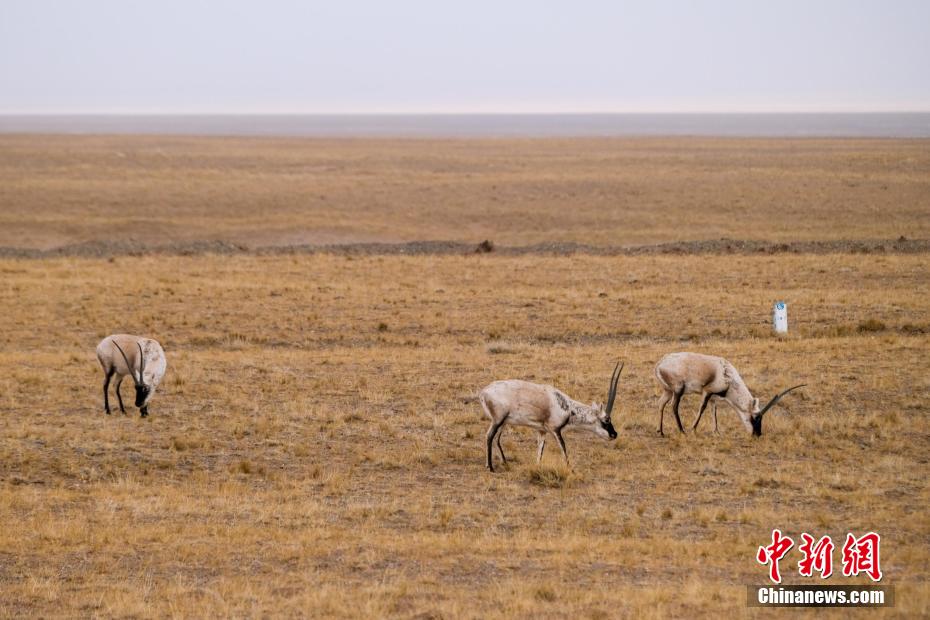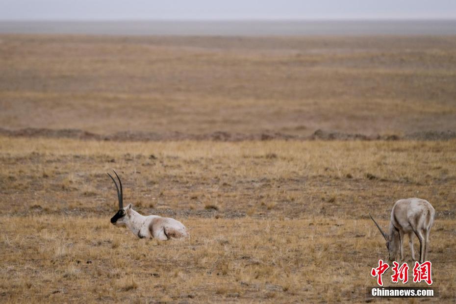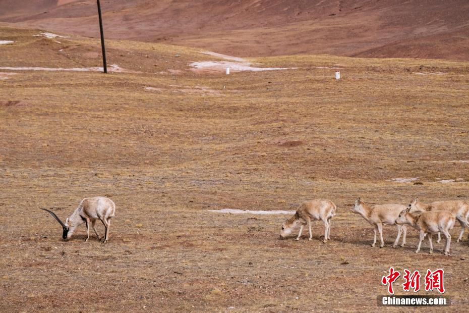 青藏公路沿線(xiàn)藏羚羊等野生動(dòng)物悠閑覓食