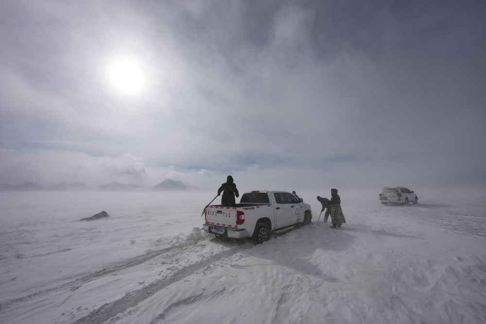 瑪曲鄉(xiāng)長(zhǎng)江源黨員環(huán)保志愿隊(duì)巡邏途中車輛陷入雪中后進(jìn)行自救(2024年2月2日攝)。新華社記者 晉美多吉 攝