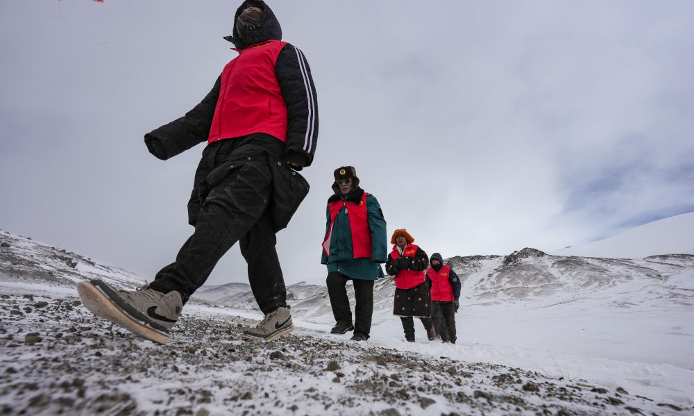 瑪曲鄉(xiāng)長(zhǎng)江源黨員環(huán)保志愿隊(duì)年近七旬的才嘎老人(右二)在巡邏守護(hù)長(zhǎng)江源(2024年2月2日攝)。新華社記者 晉美多吉 攝