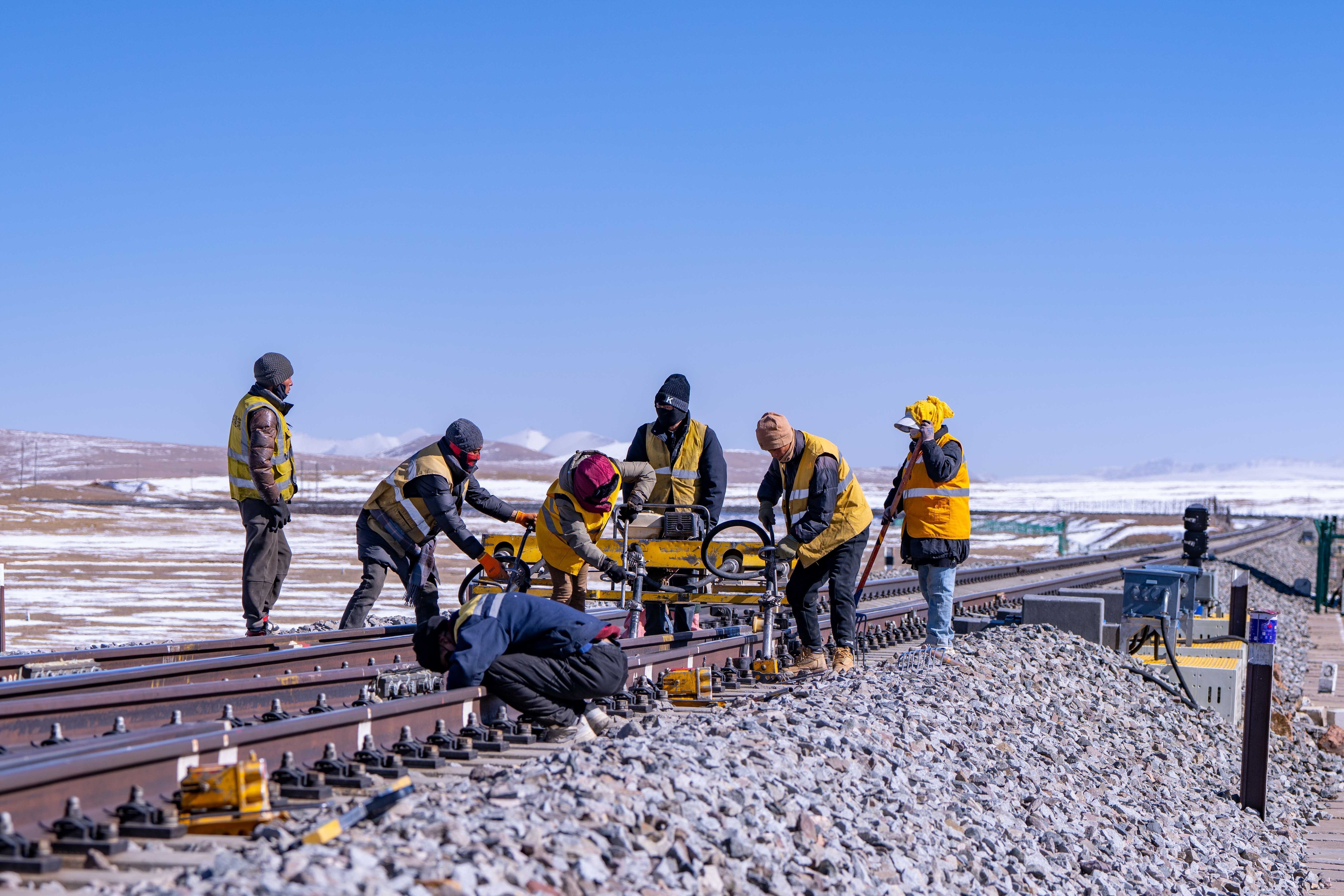 施工時間有限,工人們的速度不斷加快。馬祎俊指揮安排好幾名鐵路工人,大家各司其職,迅速開始動手維護鐵路鋼軌。天氣讓鋼軌比冰塊更加寒冷。隔著佩戴的線手套,依舊能感受到風(fēng)和鐵軌上的寒冷鉆進手套里,沁到骨頭里。