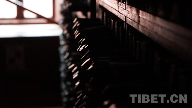 圖為德格印經(jīng)院內(nèi)擺滿印版的木架,因?yàn)橛〗?jīng)院不通電、不掌燈,所以內(nèi)部光線較為昏暗 攝影:張宇