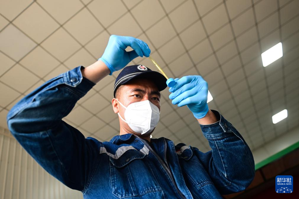 4月25日,中國鐵路青藏集團有限公司西寧工務(wù)機械段職工在提取油樣。新華社記者 張龍 攝
