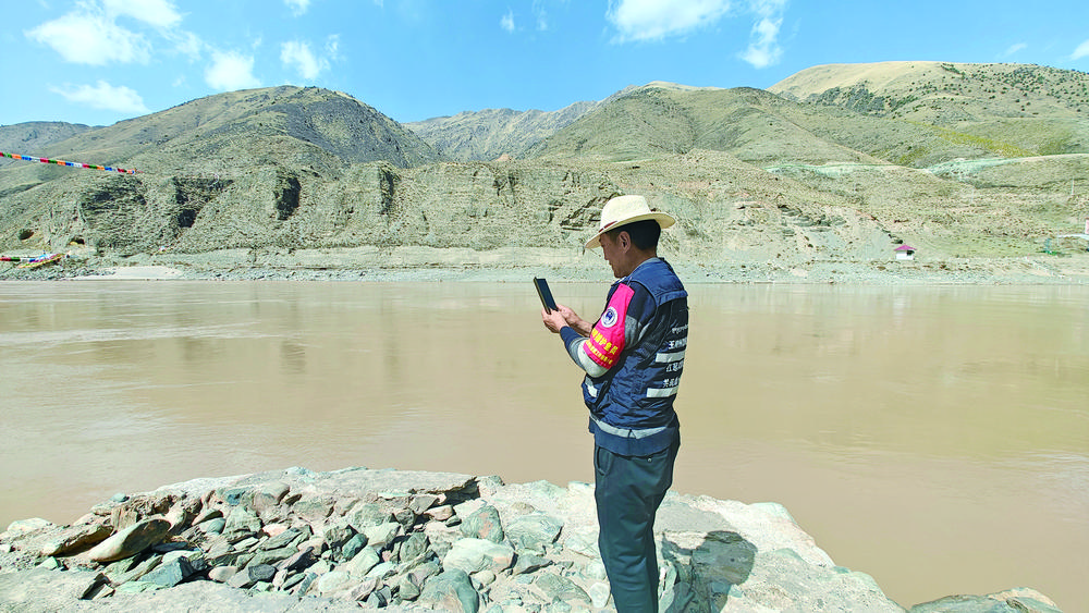 4月23日下午3時(shí)左右,洛松才仁騎著摩托車行駛在通天河畔,時(shí)而停下來用手機(jī)記錄著河流、河道的情況,時(shí)而走到河邊靜靜地望著東流的河水。