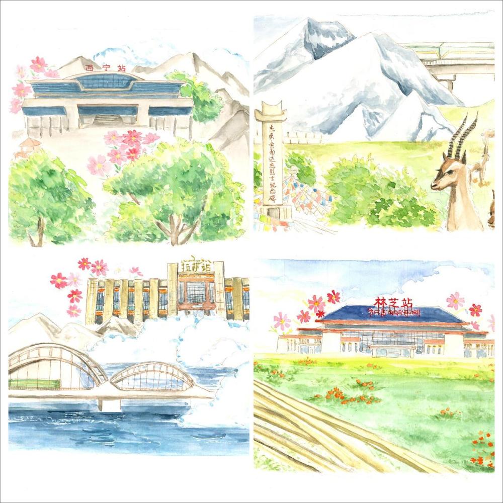 2023年,一組“魅力青藏、幸福天路”的水彩畫讓周源“火出圈”,從西寧站到林芝站,從丹噶爾古城到林芝的桃花林,長(zhǎng)長(zhǎng)的鐵軌將沿線的景觀特色串聯(lián)起來(lái),構(gòu)成一幅美輪美奐的天路長(zhǎng)圖。