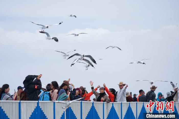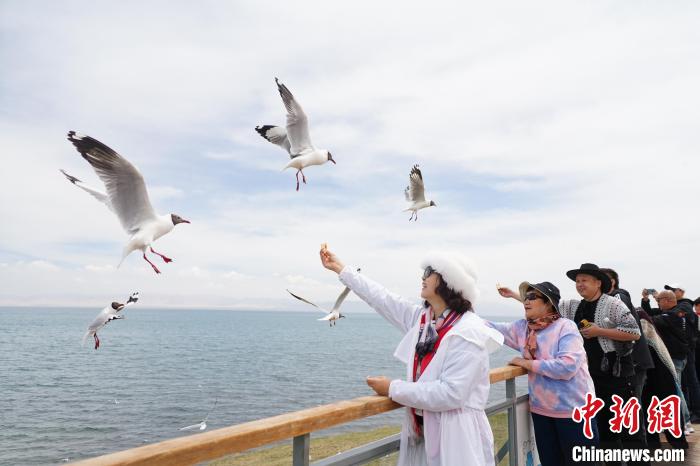 圖為游客在青海省海南藏族自治州共和縣青海湖二郎劍景區(qū)內(nèi)與棕頭鷗互動。馬銘言 攝