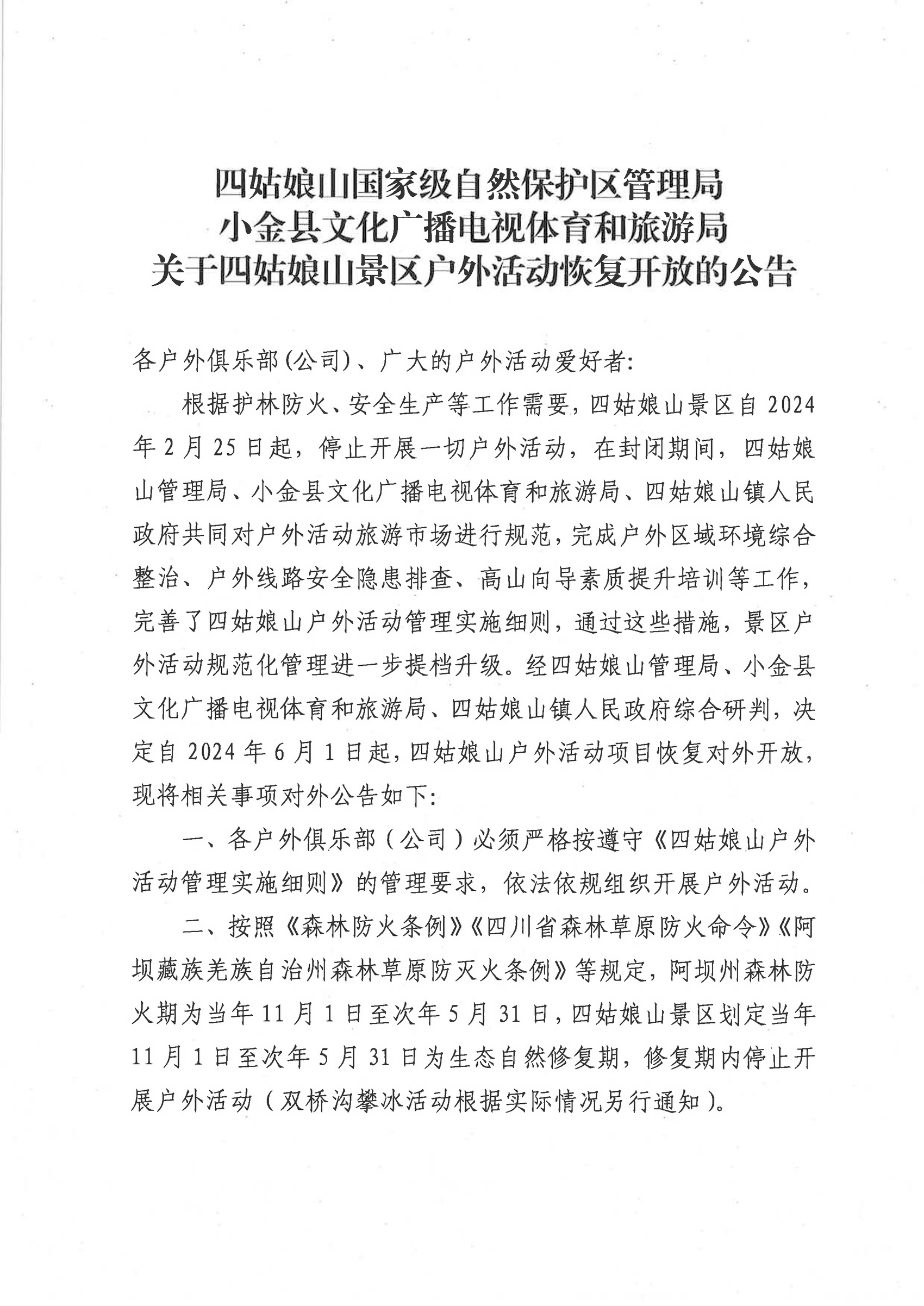 經(jīng)四姑娘山管理局、小金縣文化廣播電視體育和旅游局、四姑娘山鎮(zhèn)人民政府綜合研判,決定自2024年6月1日起,四姑娘山戶外活動項目恢復對外開放。公告要求各戶外俱樂部(公司)必須嚴格遵守《四姑娘山戶外活動管理實施細則》的管理要求,依法依規(guī)組織開展戶外活動。