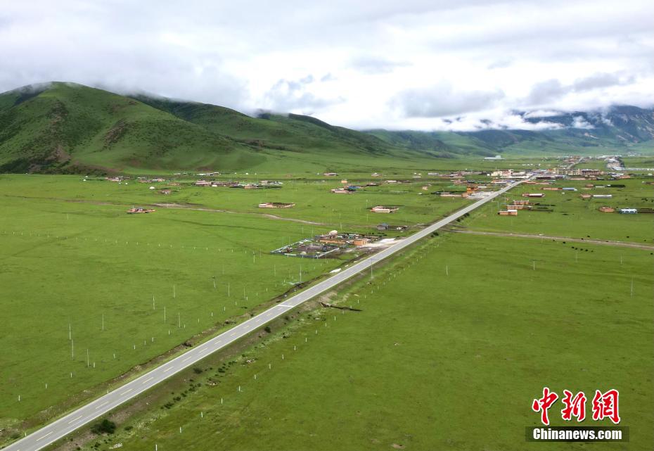 圖為6月26日,國(guó)道318線在毛埡草原上延伸。(無(wú)人機(jī)照片)中新社記者 王磊 攝