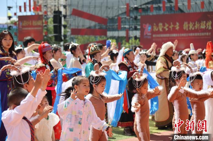 圖為身穿民族服飾的民眾和少年兒童載歌載舞。中新社記者 張?zhí)砀?攝