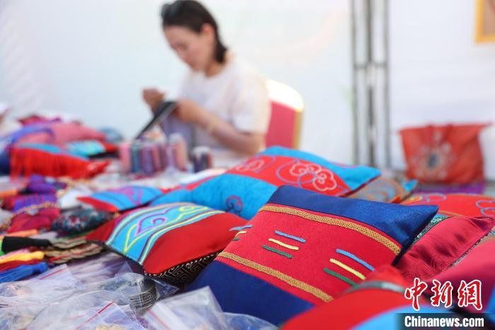 圖為民眾展示刺繡作品。中新社記者 張?zhí)砀?攝