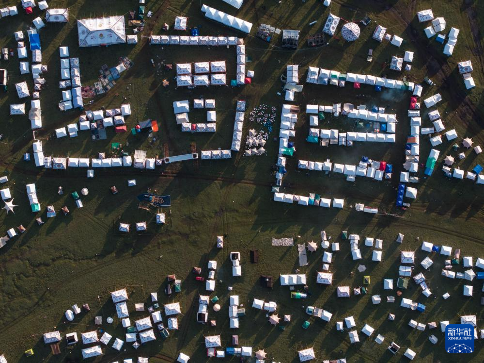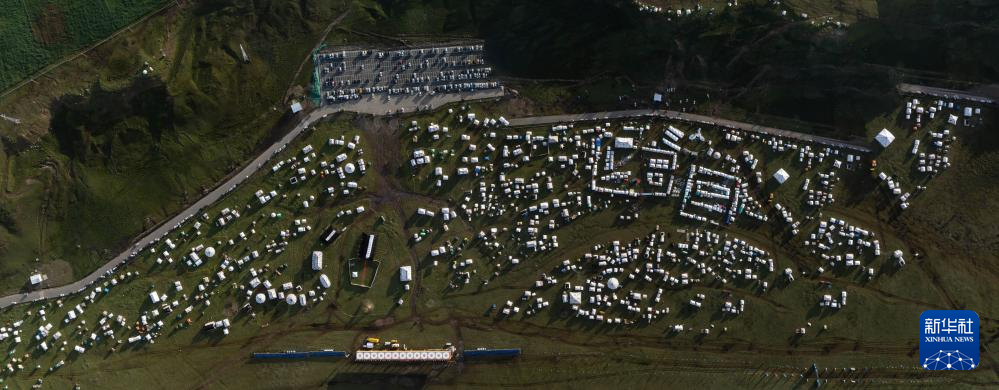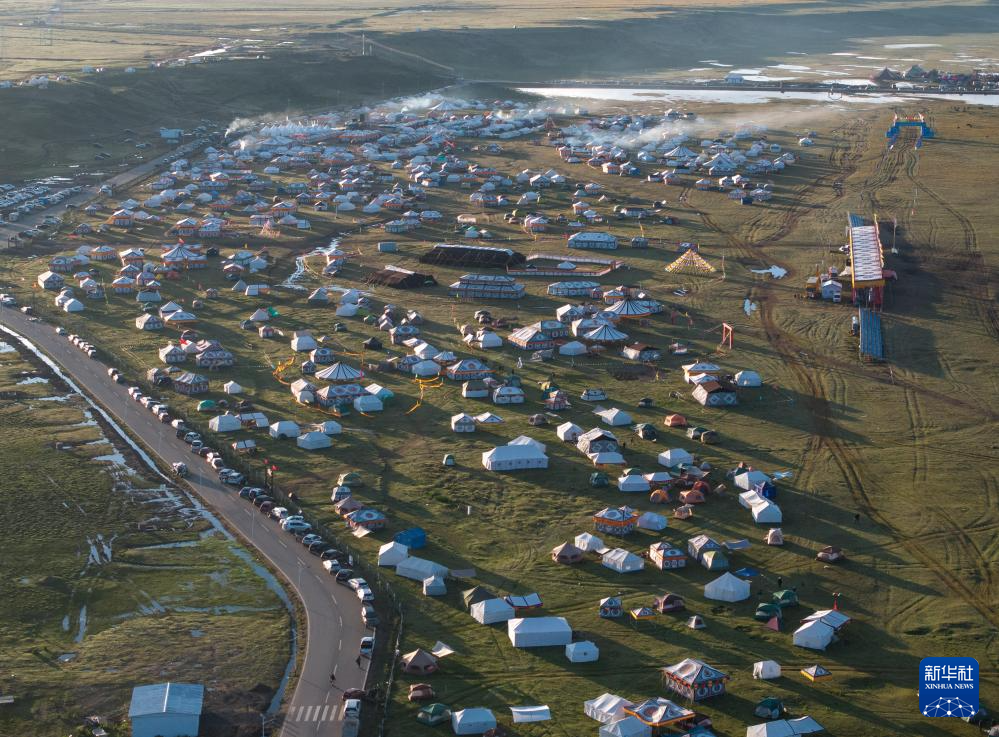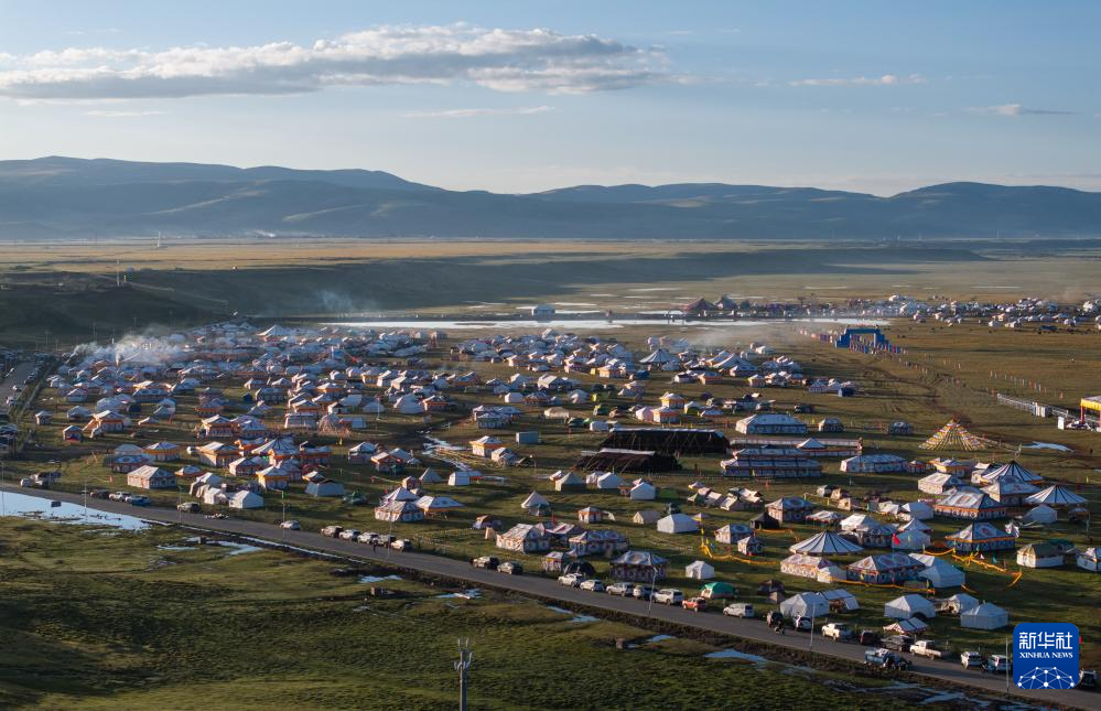 在四川省甘孜藏族自治州理塘縣多旺塘拍攝的草原上的“帳篷城”(7月31日攝,無人機照片)。新華社記者 江宏景 攝