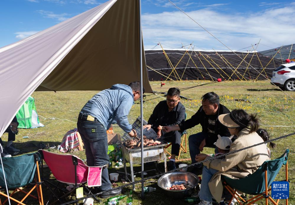 在四川省甘孜藏族自治州理塘縣多旺塘,人們在草原上支起天幕烤肉(7月31日攝)。新華社記者 江宏景 攝