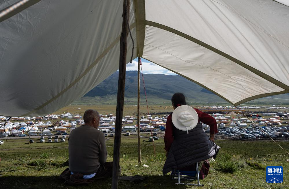 在四川省甘孜藏族自治州理塘縣多旺塘,兩位老人遠(yuǎn)眺比賽場地(7月31日攝)。新華社記者 江宏景 攝