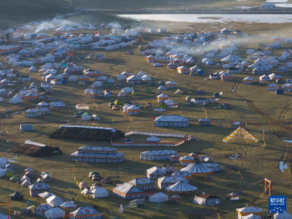 在四川省理塘縣多旺塘,當(dāng)?shù)厝罕娫诓菰现鹛炷缓蛶づ瘢?月31日攝)。新華社記者 江宏景 攝