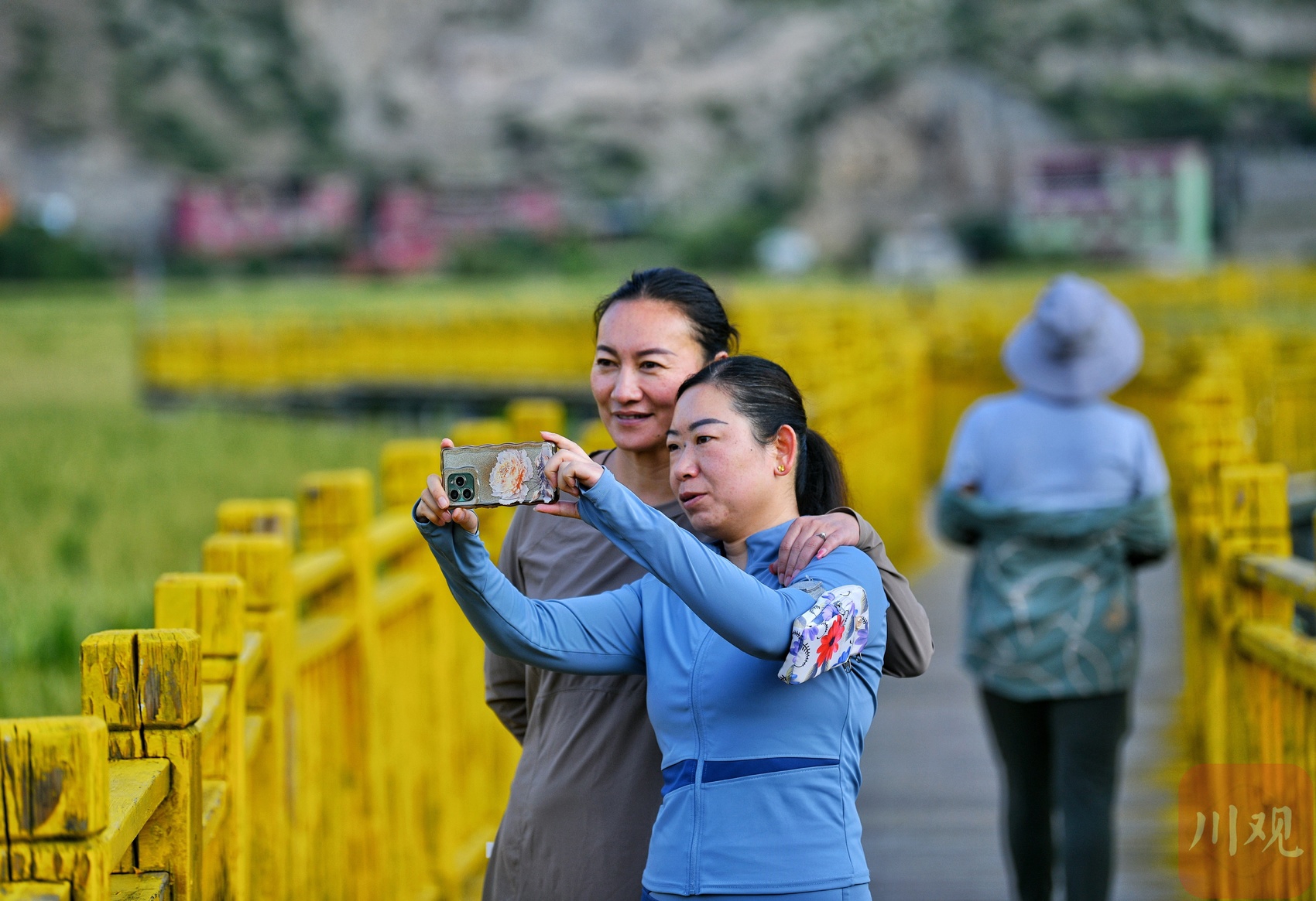 據(jù)了解,“田園棧道”是巴塘縣在農(nóng)旅結(jié)合、觀光農(nóng)業(yè)方面作為亮點打造的特色景點,現(xiàn)如今是網(wǎng)紅地,不少自駕游的旅行者都會慕名前來田園棧道打卡。吸引的不止是游客,當(dāng)?shù)鼐用褚蚕矚g早晚來這里漫步??吹接浾咴谂恼?,棧道上晨練的當(dāng)?shù)厝诵χ垼骸斑@里漂亮吧,每天都有像您這樣的人拿著相機來拍照,拍完就走一圈,走棧道一圈只需要2500步?!?/p>
