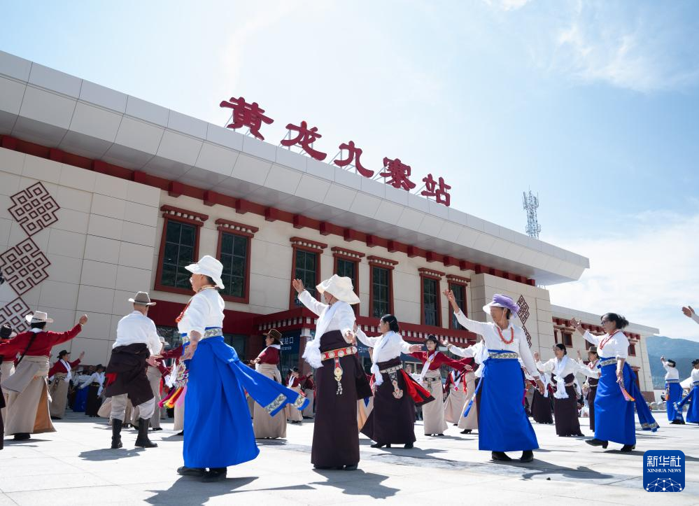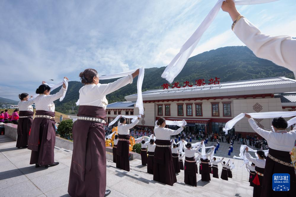 8月30日,在黃龍九寨站,當?shù)厝罕娫诖ㄇ噼F路鎮(zhèn)江關(guān)至黃勝關(guān)段開通首發(fā)儀式上跳舞慶祝。新華社記者 江宏景 攝