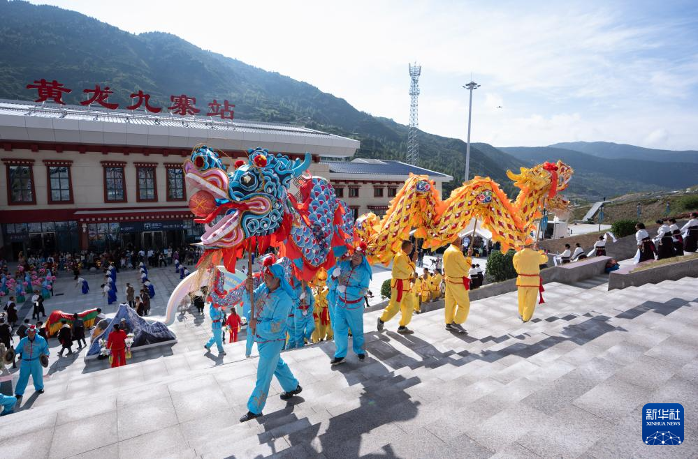 8月30日,在黃龍九寨站,當?shù)厝罕娫诖ㄇ噼F路鎮(zhèn)江關(guān)至黃勝關(guān)段開通首發(fā)儀式上舞龍。新華社記者 江宏景 攝