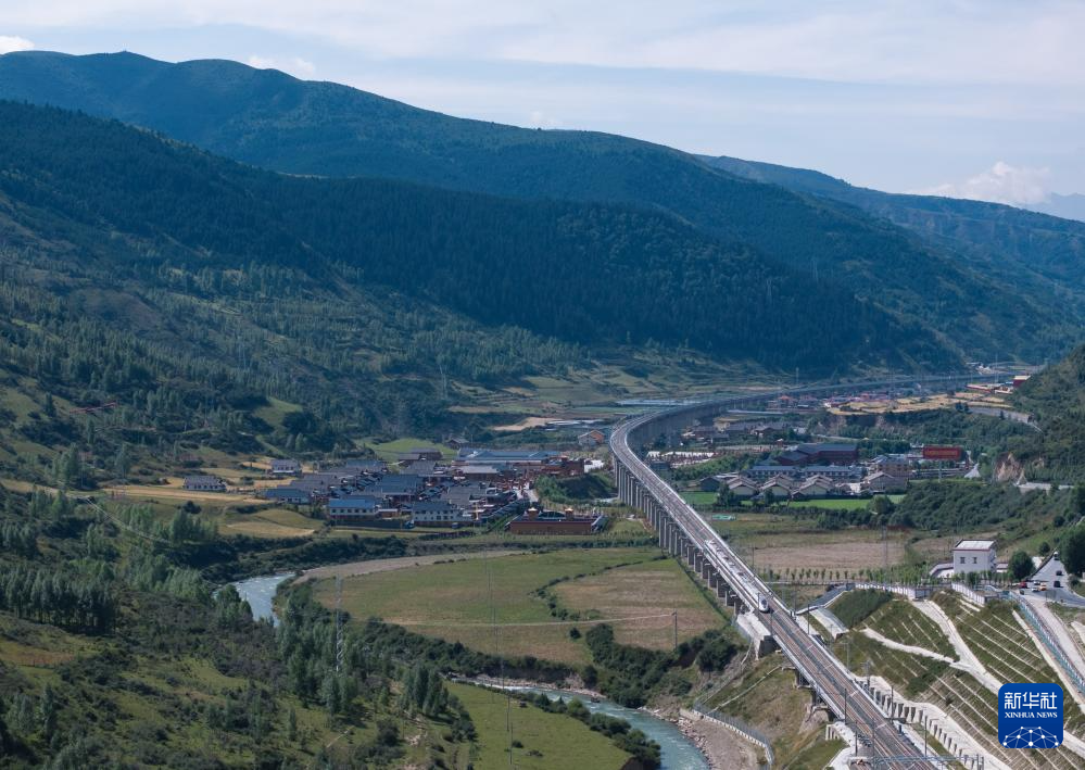 一列調(diào)試列車駛進川青鐵路黃龍九寨站(8月29日攝,無人機照片)。新華社記者 江宏景 攝