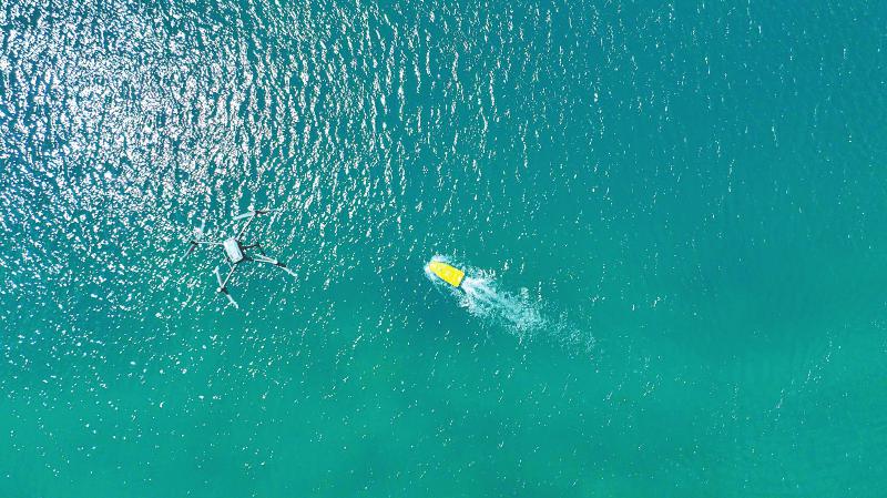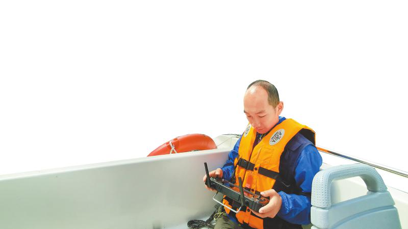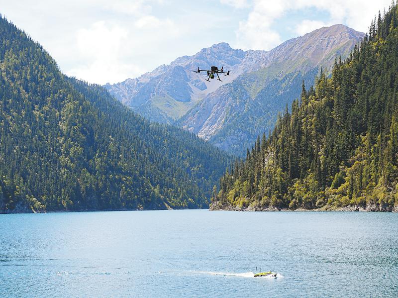 無(wú)人船與無(wú)人機(jī)相互配合,對(duì)九寨溝內(nèi)這個(gè)最大、最深的高山湖泊進(jìn)行水下、水上同步測(cè)量。韋維 攝