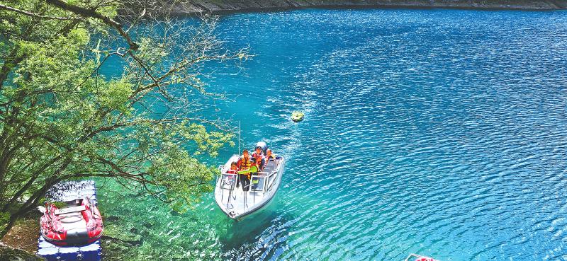 科研團(tuán)隊(duì)成員乘巡邏船在九寨溝長(zhǎng)海開(kāi)展測(cè)量工作。韋維 攝