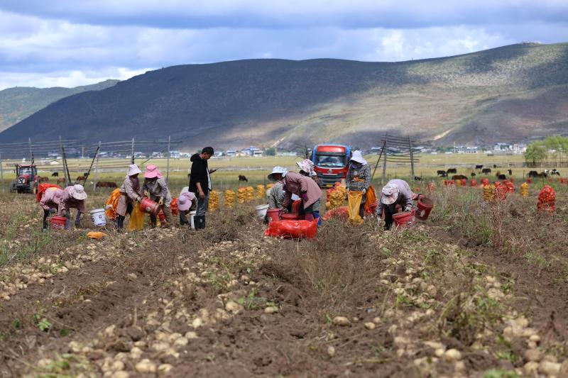 10月13日,記者在位于香格里拉市建塘鎮(zhèn)尼史村的香格里拉市滇茂農(nóng)業(yè)科技有限公司馬鈴薯種薯培育基地看到,百余畝馬鈴薯種薯喜獲豐收,工人們正忙著將機械采挖出的種薯分揀、裝袋、上車,一派繁忙景象。