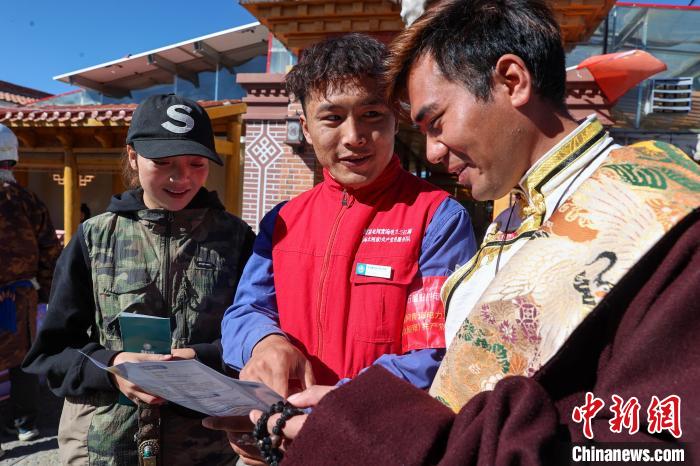 10月17日,在青海省海北藏族自治州剛察縣果洛藏貢麻村,久邁多杰為牧民介紹電力宣傳手冊。中新社記者 薛蒂 攝