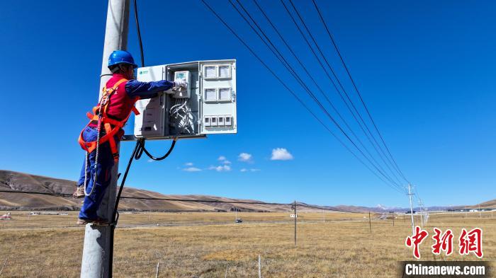 10月17日,在青海省海北藏族自治州剛察縣果洛藏貢麻村,久邁多杰檢查當(dāng)?shù)啬撩窦抑杏秒娫O(shè)備。中新社記者 薛蒂 攝